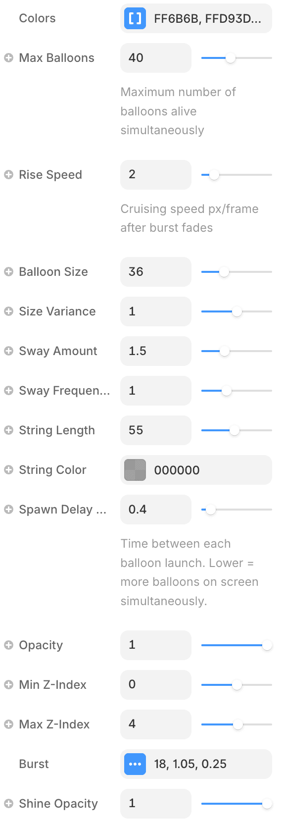 Spawn Delay controls how many seconds pass between each new balloon launching. Lower values mean more balloons on screen at once. Rise Speed is the cruising speed once a balloon is airborne. The Burst group controls what happens the moment a balloon spawns: Speed sets how fast it shoots up at launch, Duration sets how long it takes to slow down to the Rise Speed, and Stretch adds a squash and stretch deformation on that initial pop. Size Variance randomises how big each balloon is relative to the base Balloon Size, so setting it to 0 makes every balloon the same size. Min and Max Z-Index create a depth range, balloons closer to Max appear larger and in front, giving a subtle 3D feel.