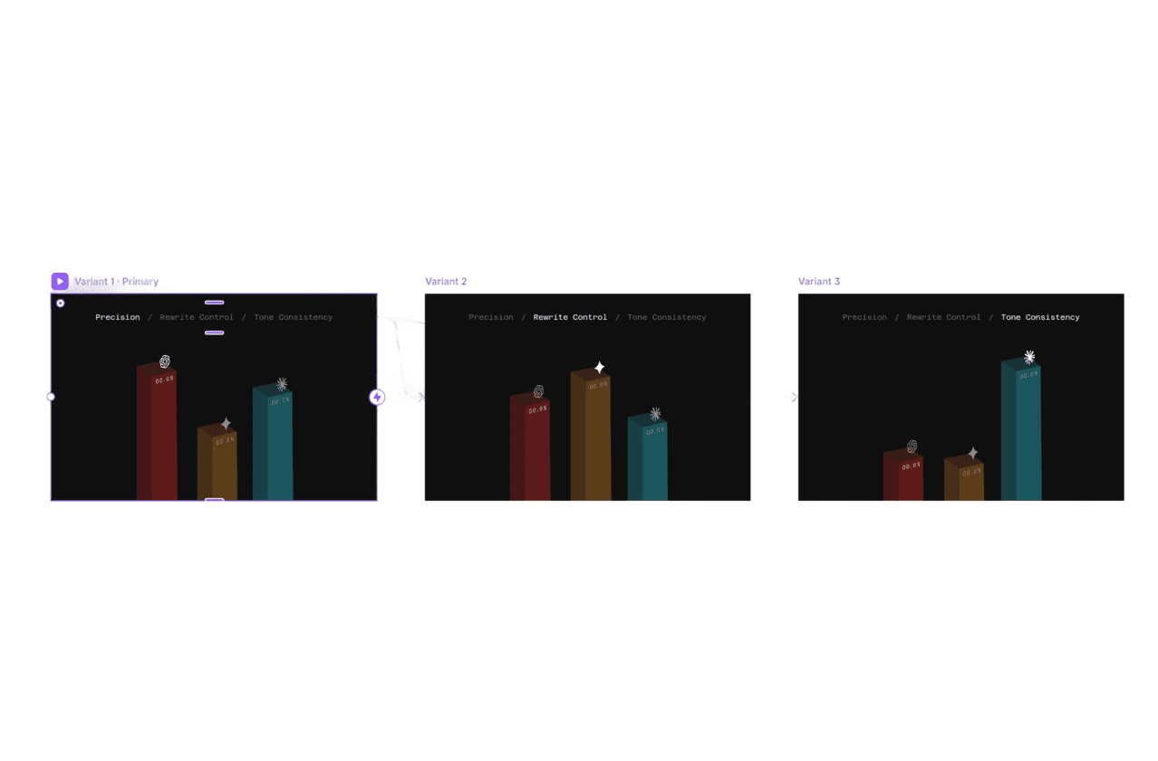 Each feature option (Precision, Rewrite Control, etc.) is a variant that defines different heights for the bars and different values for the counters. Clicking a tab switches the variant, and everything animates automatically.