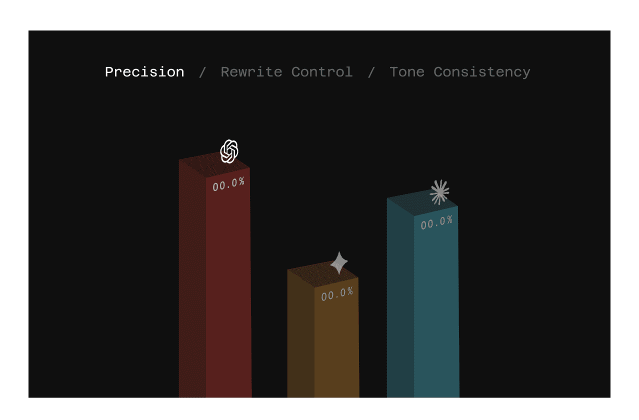 This component is a features section that lets users click through different feature categories (like Precision, Rewrite Control, Tone Consistency) to see corresponding stats visualized as 3D isometric bars. Each bar has an icon on top and a percentage value that counts up or down smoothly when switching between features. The bars animate their heights using native Framer transforms while the numbers use a separate Slot Counter component to animate between values.