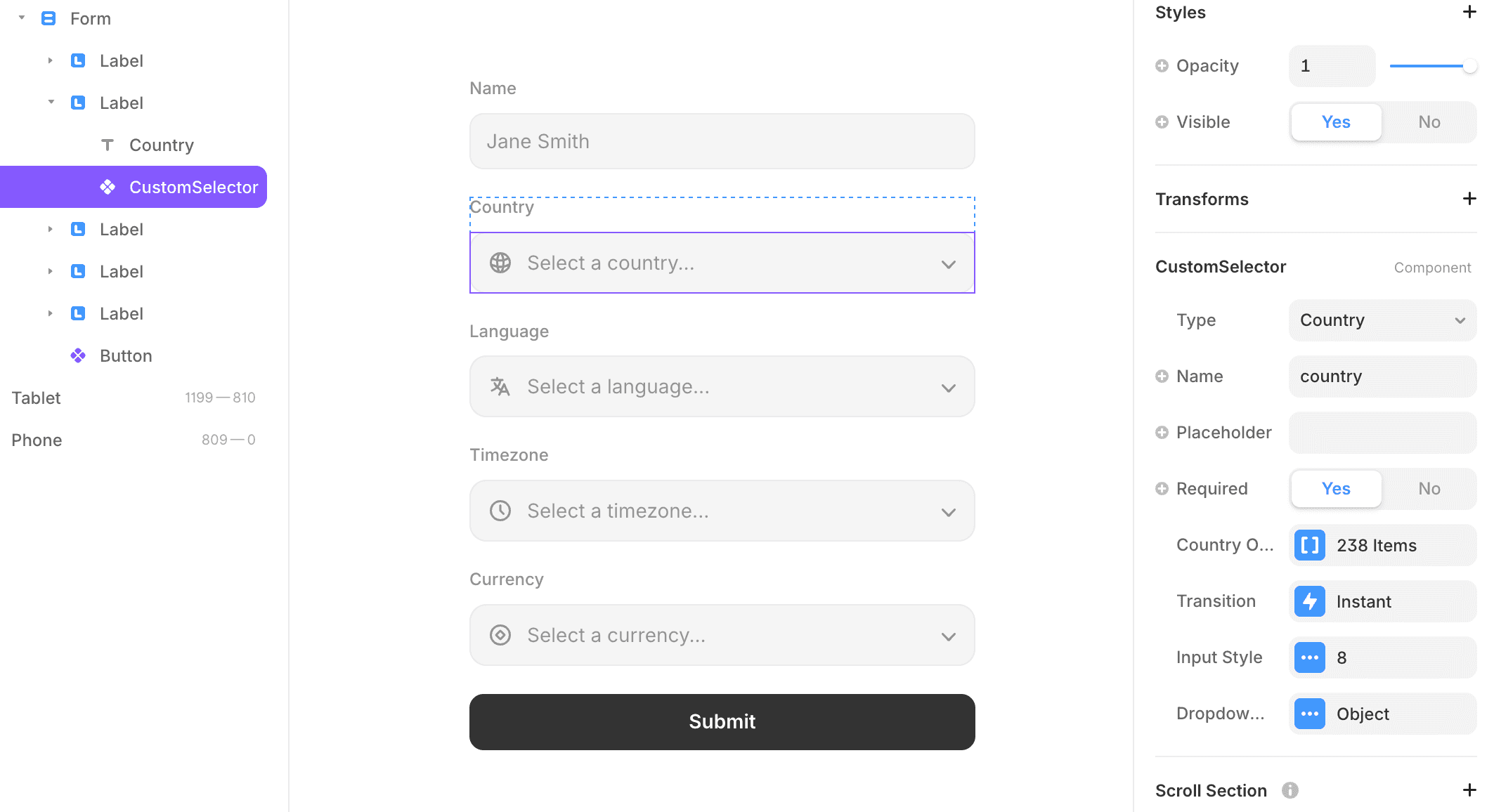 This component is a fully styled dropdown selector for your Framer forms that lets users pick a country, language, timezone, or currency from a searchable list. It comes preloaded with data for all four types that you can customize and works natively with Framer's form submission system - meaning selections get captured and sent just like any other form field, including free email notifications and Google Sheets integrations.
