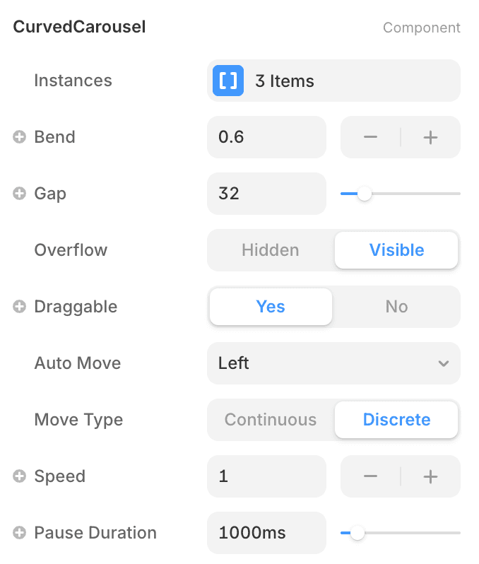 The component arranges connected items along a curved path based on your container width. Items automatically duplicate to fill the curve seamlessly. You can control the curvature with the Bend slider (0 = flat, higher = more curved), adjust spacing with Gap, and choose whether items can be dragged. Auto Move lets you set automatic scrolling in either direction, with options for smooth continuous motion or discrete item-by-item stepping with customizable pause times.