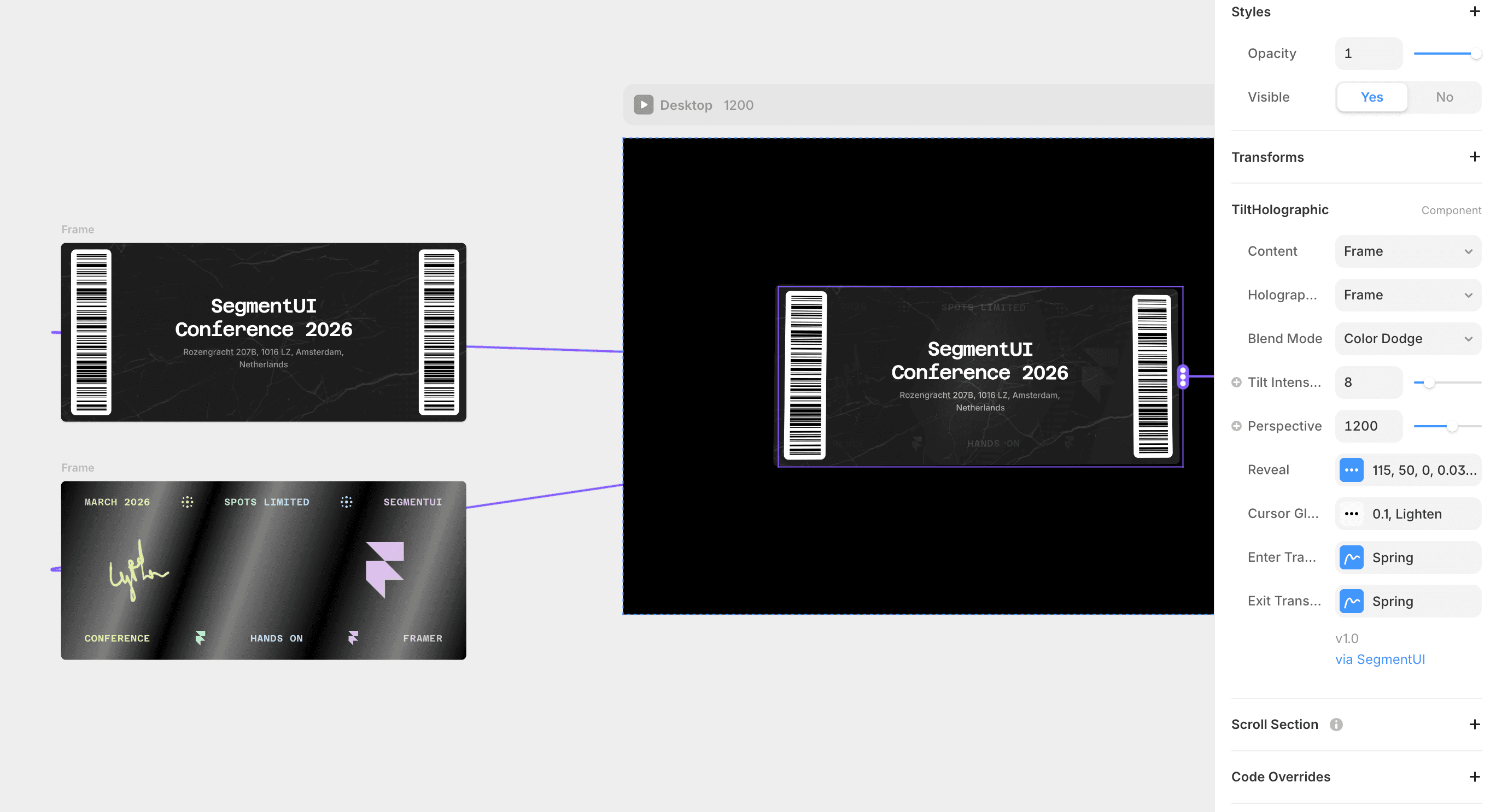 The component needs two connected layers: your main content (the ticket design) and a holographic layer (typically a gradient or iridescent image that creates the shimmer effect). On hover, your cursor reveals the holographic layer through a soft-edged spotlight while the entire card tilts in 3D space. You can control how intense the tilt is, how big the reveal spotlight is, how blurry its edges are, and the opacity of the holographic layer in different states. There's also an optional cursor glow that adds extra shine where your mouse is.