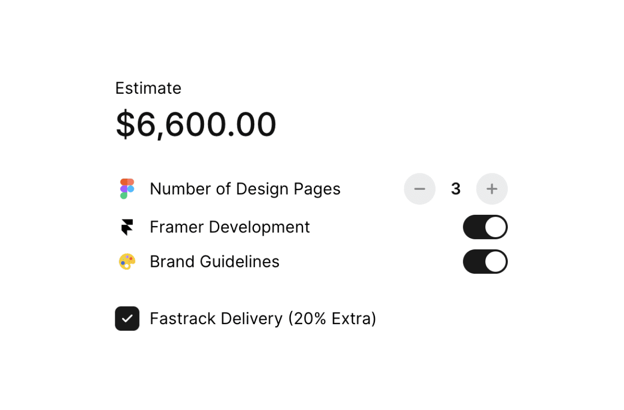 An interactive pricing calculator where toggles, checkboxes, and steppers automatically update a live price display. When users interact with the controls, the total updates instantly, adding values for selected options or applying multipliers for things like discounts or premium tiers. All components sync automatically without any code.