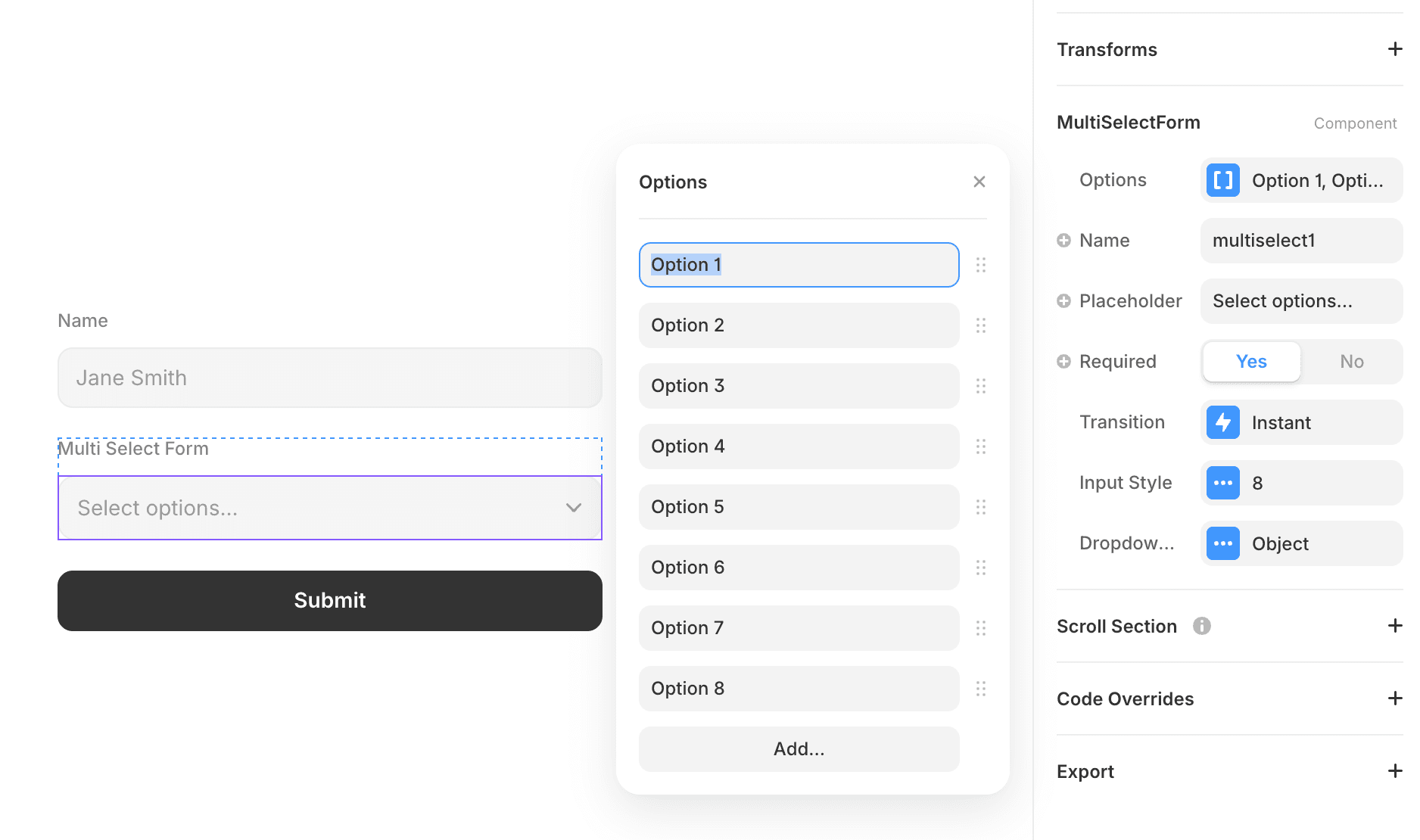 In the right panel, add your choices under Options, set the Name (the field label in your form submission), add a Placeholder, and toggle Required on or off.