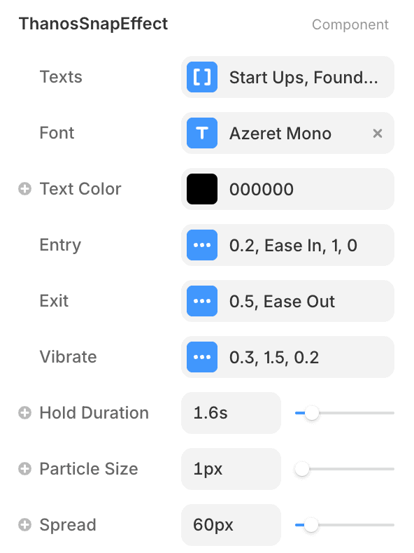 Add your text strings to the Texts array - these are the words that will cycle through the snap effect. Customize the font, color, and size to match your design. The Hold Duration controls how long each text displays before snapping. Particle Size and Spread determine how the disintegration looks. Entry animation controls how new text appears (scale, opacity, duration), while Exit animation controls the particle explosion speed. The Vibrate option adds a shake effect right before the snap for extra drama.