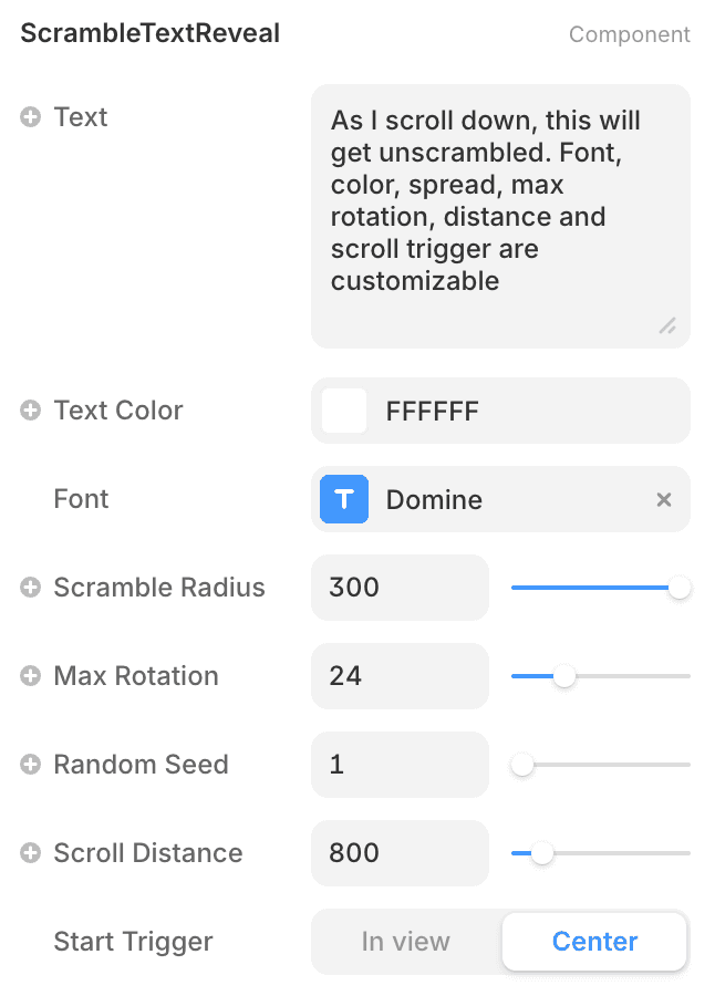Customize the animation: Scramble Radius sets how far letters scatter, Max Rotation controls the tilt angle, Scroll Distance should match the extra height you added to your parent, Start Trigger sets when the animation begins, and Random Seed changes the scramble pattern.